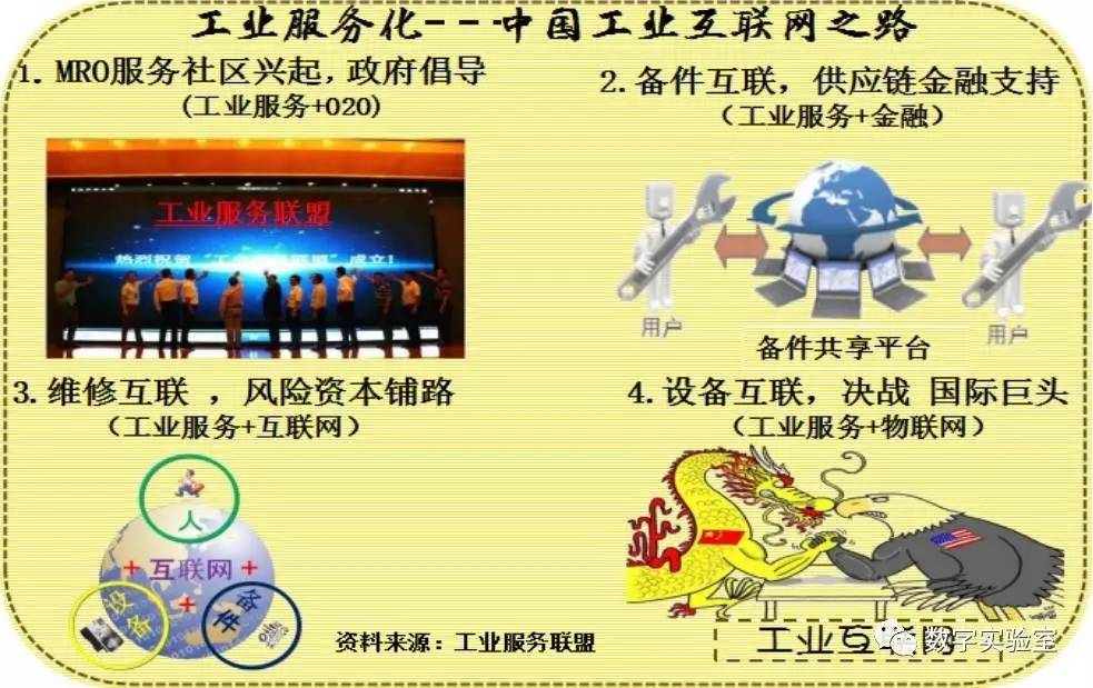 在政府支持下大力发展工业服务社区O2O业务,将工厂的“工业服务资源”通过互联网连接起来,后期风险资本介入,先是备件共享,然后是维修的业务互联,最后形成“设备互联”,从低端往高端发展工业互联网,这就是中国路径,下图就是工业服务产业发展的框架图。