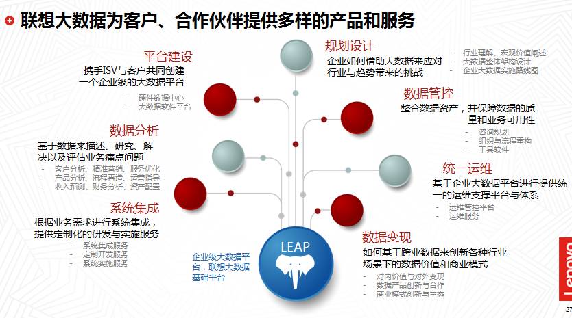 经过不断的研发与实践,联想大数据企业级分析平台LEAP及大数据服务,已经成功应用于多个行业,帮助很多制造企业实现了以数据支撑业务新发展的战略规划。联想大数据在提供多样的产品和服务的同时,与各行业客户携手共赢,打造大数据技术能力,实现业务价值释放大数据资产的生产力,共建跨业大数据技术与商业合作的全价值生态圈。