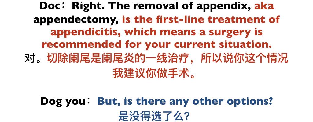 The clinical diagnosis of Appendicitis has been established after a thorough physical examination and lab test, as well as a abdominal ultrasound test. The doctor is now going to discuss treatment for your illness with you.