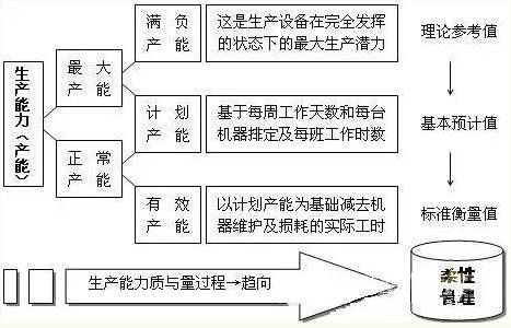 生产能力衡量,简单地说是生产设备在一定时间内(通常是每周或月)所能生产的产品数量。正常产能是过往生产设备的平均使用量,最大产能是生产设备所能最大程度产量,这是满负荷产量。它是一个理论参考值,是作为计划产能的参考。而作为计划产能是未有把相关主客观因素考虑在内工时计算。因此,标准衡量值也就是有效产能。它是使用机器和设备生产中,把维修、待料和生产过程返修的不良品等因素都考虑在内,从而作为考核生产部门的标准(业绩指标)基准。其生产能力体现的质与量过程和趋向,正是不遗余力地贴近柔性管理,也就是在充分预估人、物、机各种情况下,获得生产计划与实际完成的调节、变通和灵活掌控。
