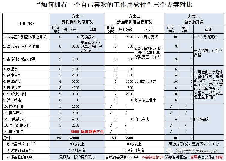 按照目前市场行情,假定李明是某单位的普通工作人员,他需要一个的软件,和软件公司一洽谈,该软件费用要5万元左右,我们来看看软件公司做了哪些事情,并结合时间成本和费用成本入手,具体分析一下,如下表所示(单击下表可以放大显示):
