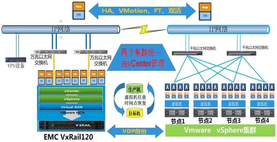 应用:配置4节点的超融合系统EMC VxRail 120,将现有的核心业务应用物理机全部迁移至VxRail超融合中。另将现有的相对新的4台物理服务器利旧组成一个VMware vsphere集群,承担一些非核心轻量应用部署,这样由一个vCenter统一控制和管理两个集群。