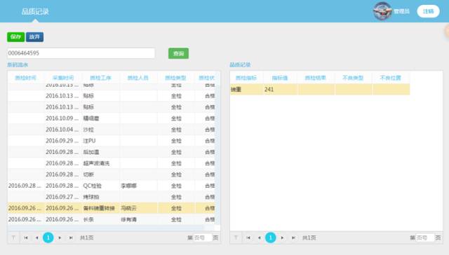 侨兴车间现场安装了600多个RFID读卡器,120多台工业平板、20多台手持终端,30多台智能打印机,同时与生产现场重平仪,电子秤等数字化检测设备实现数据连接。借助全面覆盖生产现场的wifi网络,构建了智能数据采集系统,实时采集每个单品共115道加工工序的单品制程数据以及品质相关的首件、全检、巡检等数据信息,上图为品质记录功能画面用于显示每个单品的不同工序质量检验结果信息。