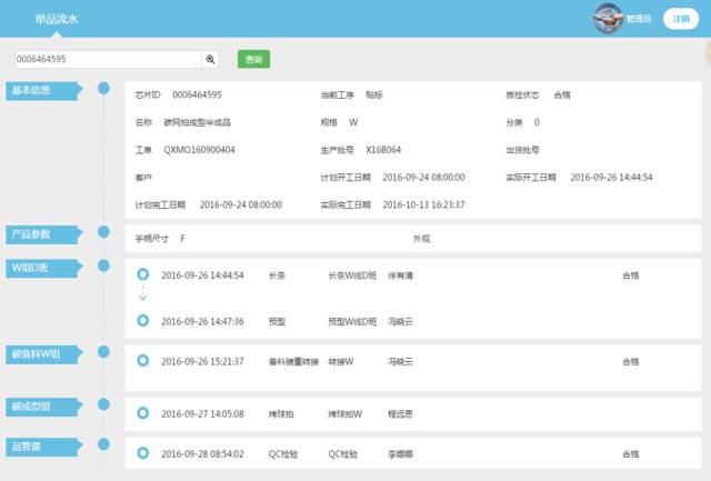 单品流水功能用于显示每支球拍整个生产制程115到工序加工流水信息。用户通过此功能可以快速方便查找当前球拍每道工序的加工时间、加工工位、操作工人以及品质检验信息。
