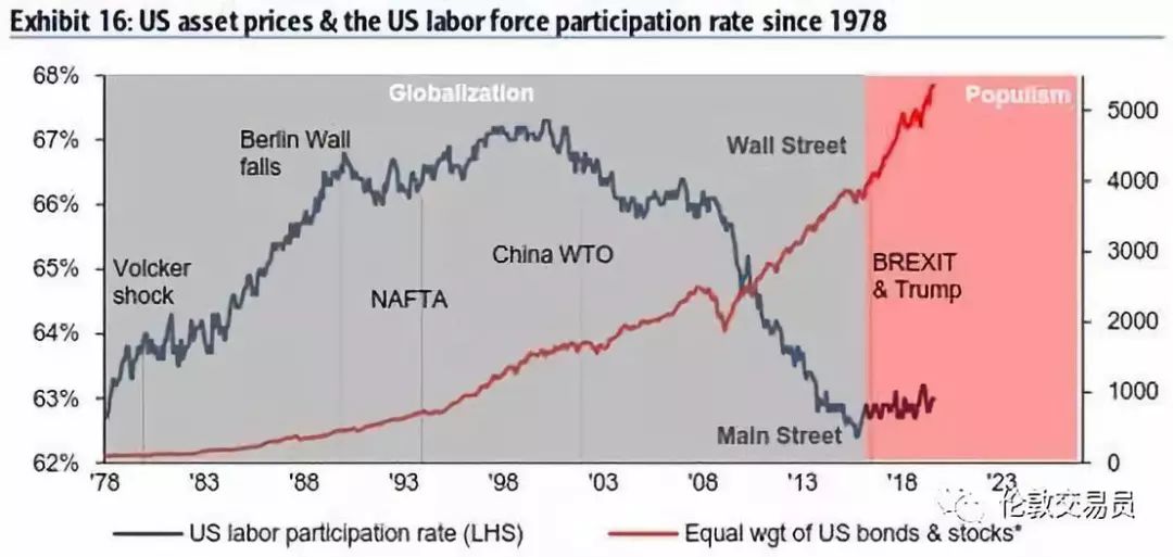 图:美国过去的20年金融牛市 与 不断降低的美国劳动参与率(就业机会转移至成本更低的海外)