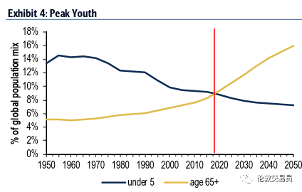 随着寿命的延长与出生率的降低,2020年起,全球老年人口将首次超过儿童人口(下图)