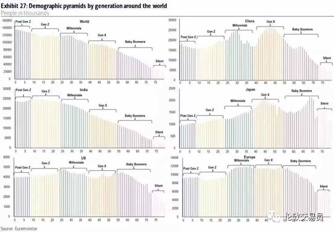 不过,虽然老龄化是大趋势,但各个国家的人口结构仍有局部的'小趋势'红利(下图,中国的人口分层最为明显)。