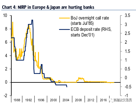 图:日本央行与欧洲央行早已进入负利率时代,但它也对银行系统产生了负面影响