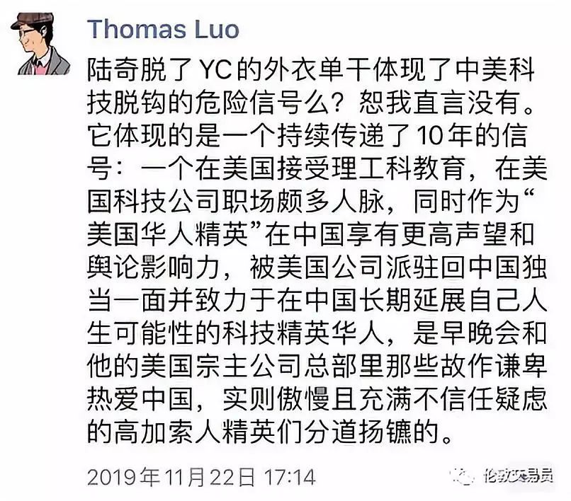 而近期美国知名创投机构Y Combinator撤出中国、留下陆奇另立门户,这似乎也是另一个见微知著的'小信号'。从伦敦君常年在海外生活工作的经历来看,说实话,许多老外是不相信中国人是能搞原创创新的(但这个负面印象,也离不开国内这些抄袭、P图的院士)。