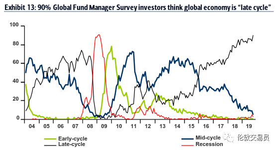 图:超过90%的全球基金管理人认为全球经济已走到晚期