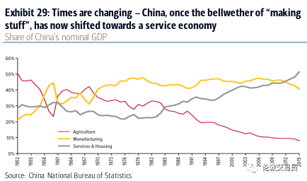中国已从曾经的制造业大国,转变成了服务业大国,似乎即将重走一遍美国黄金时代的老路(读者可对比上下两图)。