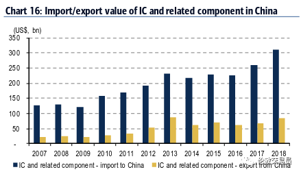 图:中国集成电路产业的进口额(蓝色)与出口额(黄色)