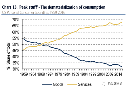 随着高浪费的物欲社会的过去、以及共享经济与服务经济的普及,实物消费的占比已越发低于服务消费。