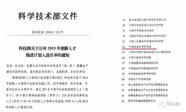 34.创新人才培养取得新成绩。2016年,我院成功入选科技部创新人才培养示范基地;铁建所研究员王继军入选第二批国家“万人计划”领军人才;大力选派优秀青年骨干赴境外深造,来自铁建、通号、运经、基础所的4名青年人才获总公司批准,创新人才培养迈出新的步伐。