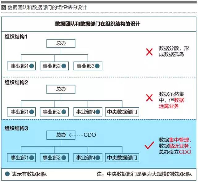我们认为,较为合理的数据团队在组织架构时应该这样设立(如图中的组织架构3):首先是设立公司级的中央数据部门,集中存储和管理数据;其次是每个事业部(或业务部门)设立数据团队;第三是在总办设立CDO的岗位。这样的好处在于数据能够集中管理,数据贴近业务,可以更好地发挥数据价值;同时,在总办(高管团队)设立CDO岗位,可以让数据更好地为决策层服务,数据分析所发现的商业价值也可以更快地应用于业务战略调整。