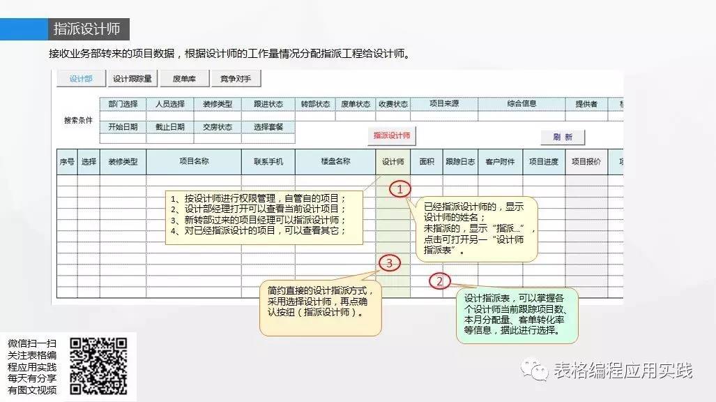 本视频教程中包括了二种指派设计师的方法,简约模式是以另一个系统中的调配业务员的案例来分析讲解的。重点是复杂情况下的设计部的指派设计师管理模式。