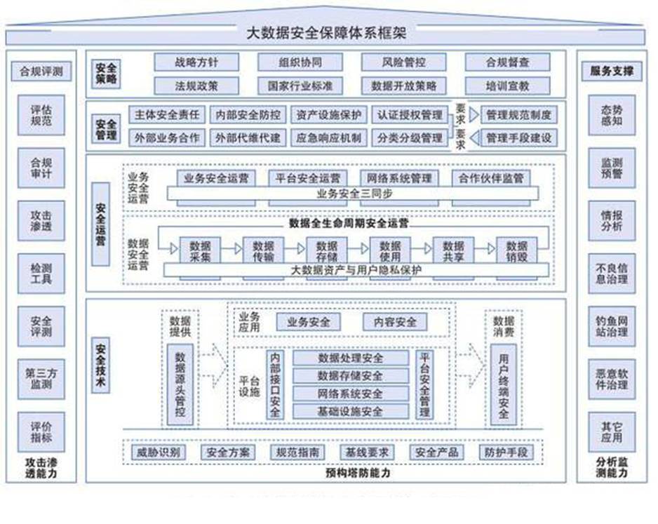 中国移动大数据安全保障体系涉及安全策略、安全管理、安全运营、安全技术、合规评测、服务支撑等六大体系: