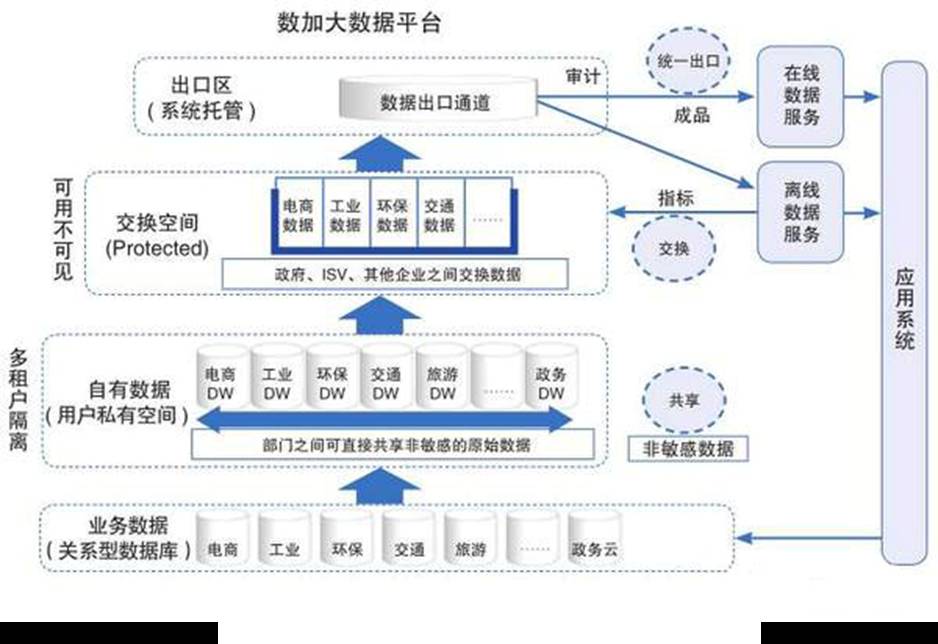 为了保障数据共享和交换过程中的数据安全,数家大数据平台通过安全机制和管控措施实现不同用户之间数据的“可用不可见”,具体如下图所示: