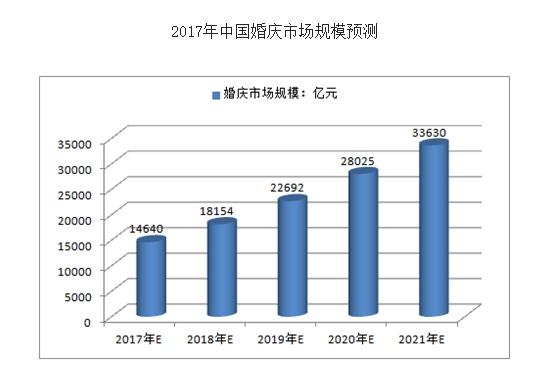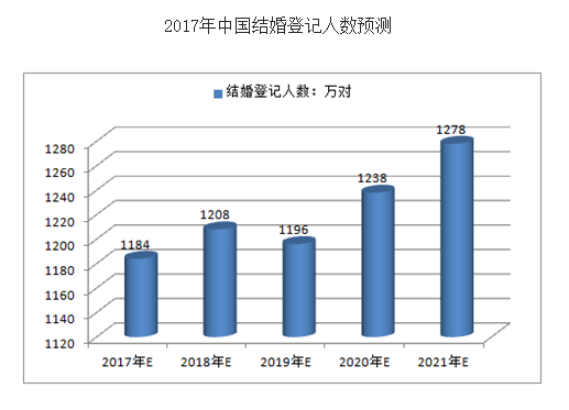 预计2017年我国结婚登记人数将达到1,184万对,未来五年(2017-2021)年均复合增长率约为1.91%,2021年结婚登记人数将达到1,278万对。
