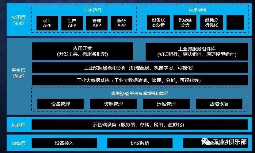 第四,工业互联网平台是面向制造业数字化、网络化、智能化需求,构建基于海量数据采集、汇聚、分析和服务体系。数据+模型=平台,边缘数据是基础,工业IaaS是支撑,工业PaaS是核心,工业APP是关键。