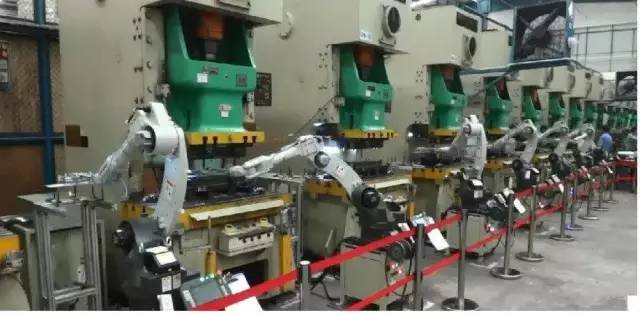 冲压生产用机器人除了要求负载大、运行轨迹精确及性能稳定可靠等搬运机器人所共有的特性,还要满足频繁起/制动、作业范围大、工件尺寸及回转面积大等特点。各个厂家的冲压机器人都在普通搬运机器人的基础上加大了电动机功率及减速机规格,加长了手臂,并广泛采用棚架式安装结构。