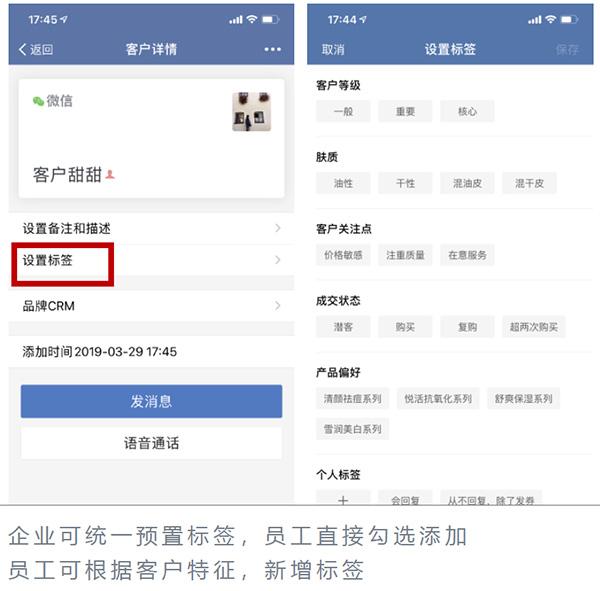利用企业微信记录顾客的个性化信息,企业可预置标签,导购可以根据客户特征进行勾选,也可以进行新增标签