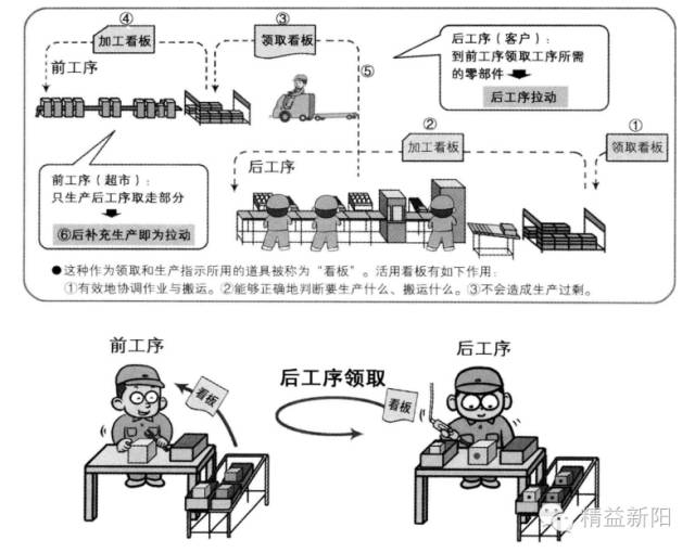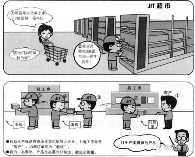拉动生产方式是从超市得到的启发所创造出来,超市为了供应给随时前来的顾客事先备齐物品,顾客(后工序)对需要的物品在需要的时候前往超市(前工序)购买需要的量,而前工序只生产(补给)被拿走的部分,这种生产方式被称为拉动式生产方式。而作为领料及生产指令所用的工单即为“看板”,实际它并不是板,而是“纸单”。