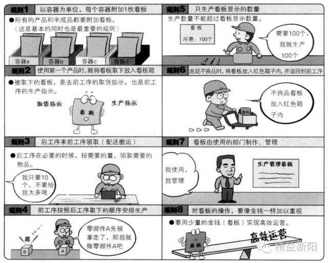 看板是对现场进行高效管理的工具,但如果使用不当,不但达不到预期的效果,反而会成为阻碍成功的凶器,要想真正的实施拉动式生产,绝对要遵守看板运营规则。没有看板下道工序就不能生产,没有看板的物品也不能领取,还有不能领取和生产超过看板数量的产品。看板运营中必须遵守8项基本规则: