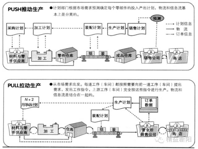 在推动生产中,每一工序都根据生产计划,大量地生产以便尽快的完成生产任务,生产出的零部件不管下道工序是否需要,只要按照生产计划送到下道工序,各个工序之间相互独立,上工序不对下道工序负责,这样的后果不仅造成大量物品的堆积,而且也不能满足准时化生产的需求,而拉动式生产刚好在需要的时候按照需要的量向下道工序供给需要的零部件。