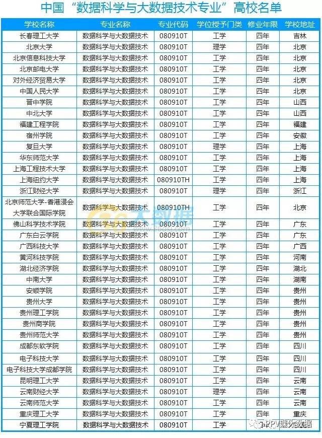 从统计表可以看出,开通了大数据专业的学校主要分布在一线城市(北京、上海、广州)以及云南、贵州和四川三个西南地区。