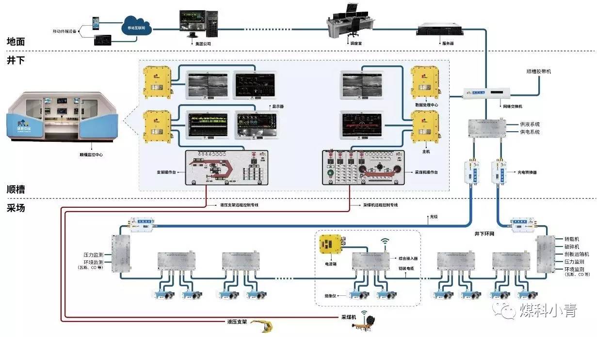 采煤机:实现采煤机远程遥控及可视化、采煤机工作面中自动记忆截割、采煤机及三机协调控制、采煤机故障在线监测及保护、通过安装惯导系统实现采煤机精确定位、结合LASC系统实现工作面的自动找直和智能控制。