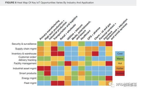 Forrester预测,交通运输、政府部门的安保与监控零售和库存管理以及初级制造业的工业资产管理将是未来物联网增长的热门领域。相比小公司,大企业更有可能使用物联网。调查中23%的大型受访企业在使用物联网,中小企业中,这个比例只有14%。