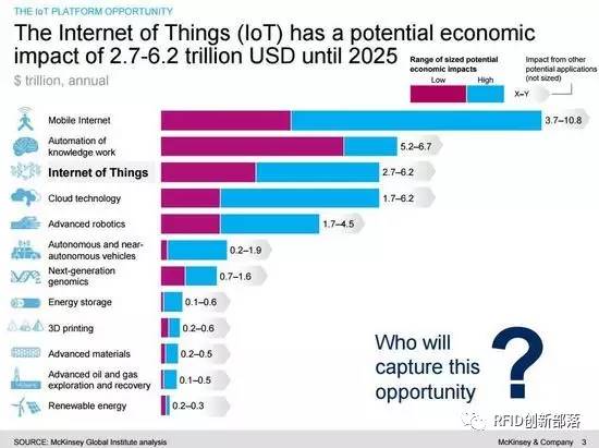 麦肯锡估计,物联网市场总规模2015年达到9亿美元,2020年将达37亿美元,达到32.6%的年复合增长率。2025年之前,物联网的潜在经济影响力为2.7~6.2万亿美元。