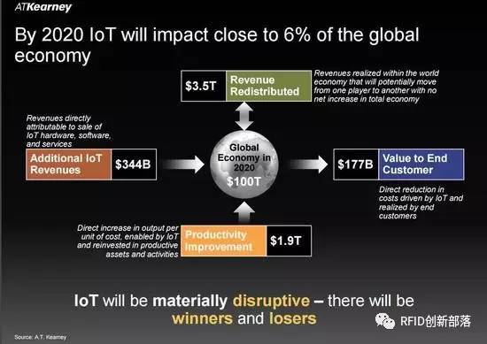物联网硬件、软件和相关服务将在2020年之前带来3440亿美元的收入。Kearney预测物联网的使用将带来1.9万亿美元的生产力提升和1770亿美元的生产成本降低。