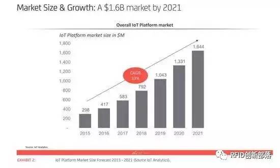 物联网平台的全球市场在2015年达到2.98亿美元,复合增长率为33%,预计2021年将达到16亿美元。PTC是物联网平台领导者,占据了18%的市场份额。2015年上报收入5300万美元,2014年则是520万美元。