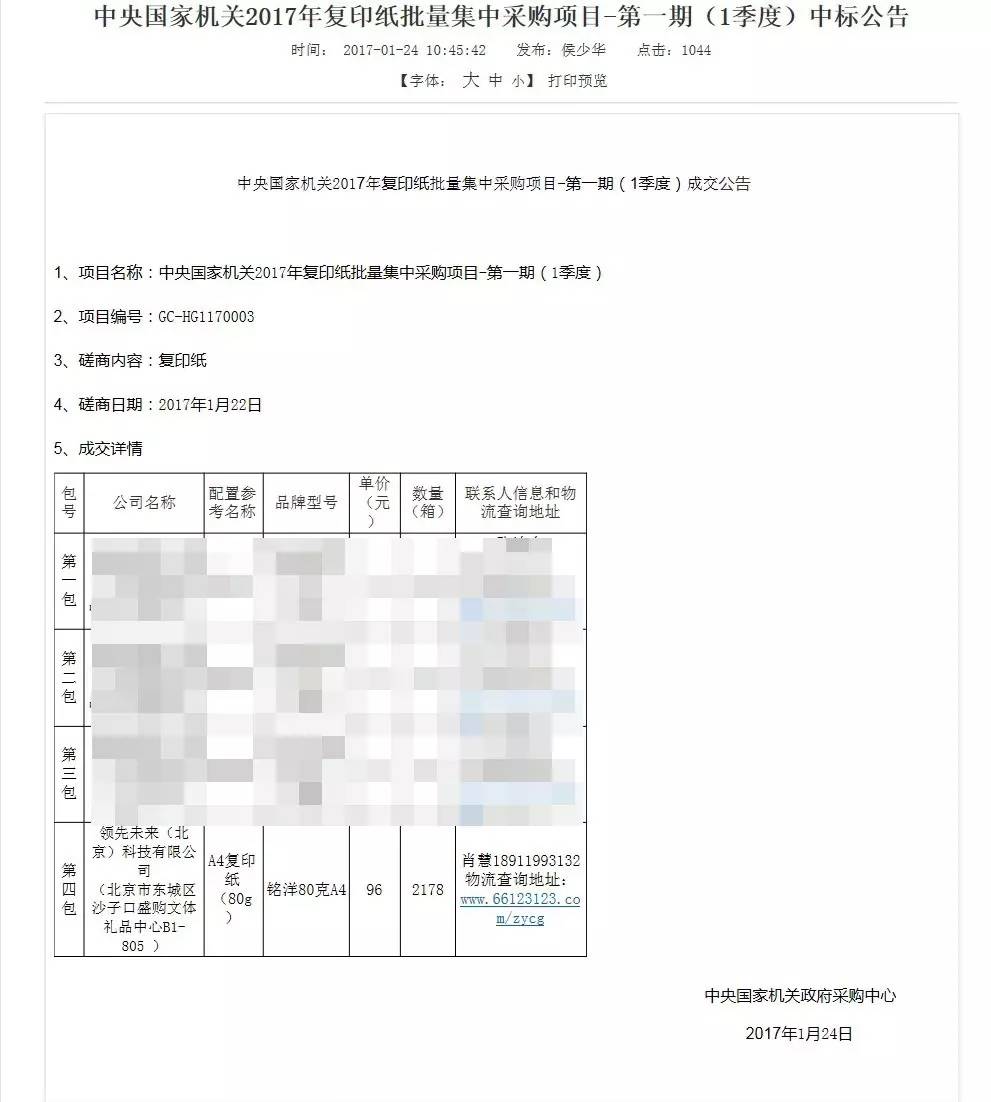 2017年1月24日,中央国家机关政府采购中心公布中央国家机关2017年复印纸批量集中采购项目-第一期(1季度)中标公告,领先未来(北京)科技有限公司以践行服务宗旨、满足客户采购需求、拥有完善的销售售后服务、精准打通事业单位采购需求等优秀的条件成功中标。