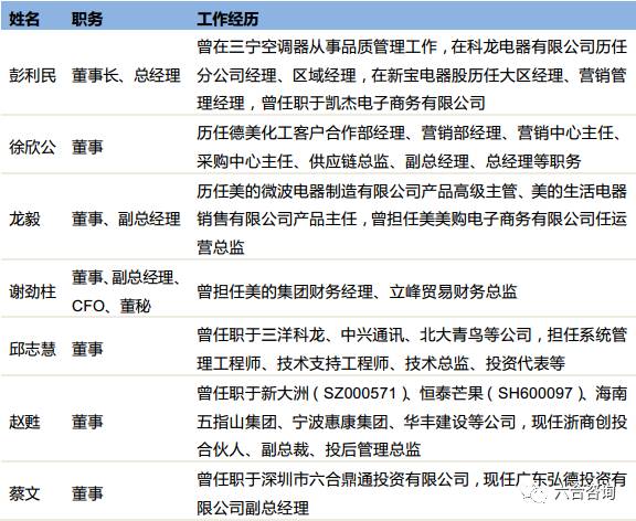 公司核心管理团队均有在美的、科龙、新宝等知名家电厂商工作经历,了解家电企业消费潮流、生产技术和运营流程,积累丰富的家电销售经验。公司董事长彭利民曾在三宁、科龙、新宝等具有丰富从业经验;董事龙毅,董事、副总经理、CFO、董秘谢劲柱曾任职于美的,负责产品、新渠道及品牌管理、客户服务、财务等。