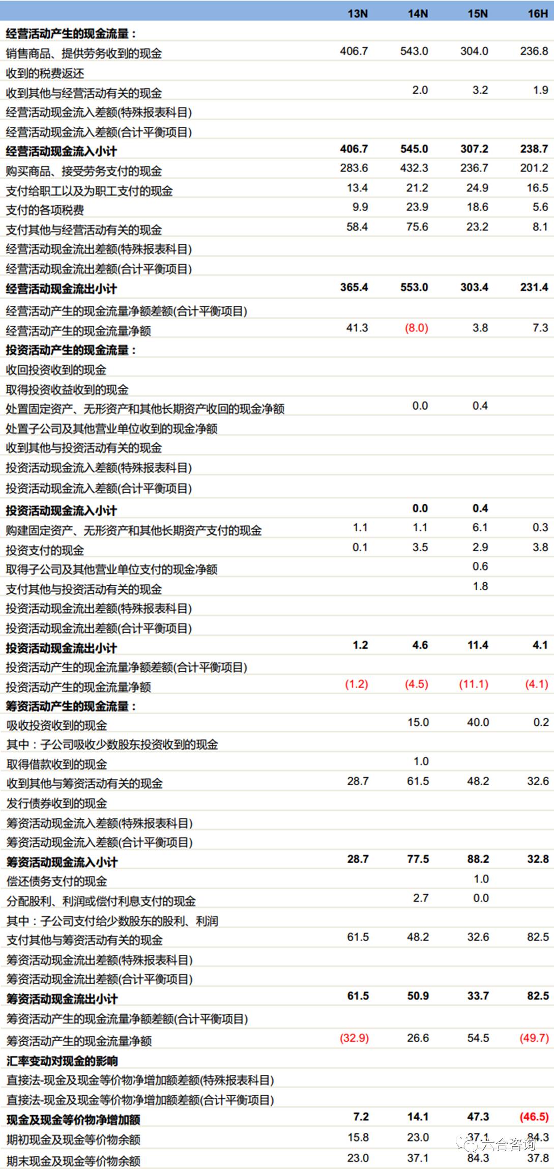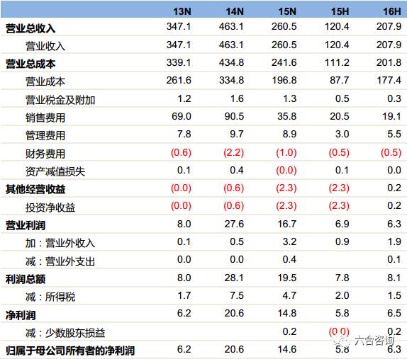 总收入:2013~2015年、2016年上半年分别为3.5亿、4.6亿(+33.4%)、2.6亿(-43.7%)、2.1亿(+72.7%)。