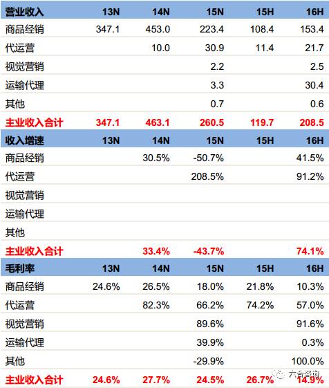 商品经销服务:2013~2015年、2016年上半年该业务收入分别为3.5亿、4.5亿(+30.5%)、2.2亿(-50.7%)和1.5亿(+41.5%),毛利率分别为24.6%、26.5%、18.0%和10.3%。