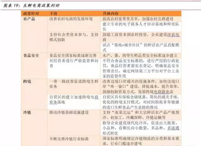 政策法规助力生鲜电商发展。生鲜农产品的销售历来是各级政府的关注重点,“互联网+”大背景下,生鲜电商无疑是破解这一难题的新思路。政府出台多项政策,从销售渠道、食品安全、跨境、物流配送等多角度全方位支持生鲜电商行业发展。例如提高农村宽带普及率,完善食品安全相关法律规范市场,一带一路政策和自贸区建立,完善冷链物流行业标准,加强冷链基础设施建设等。