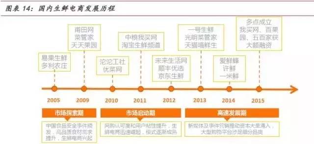③高速发展期:自2012年顺丰优选、京东生鲜频道上线,生鲜电商开始广受市场关注,步入高速发展期;