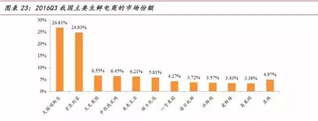 生鲜行业竞争较为激烈,天猫喵鲜生和京东到家依靠集团雄厚的资金在群雄角逐的市场中脱颖而出, 2016Q3在生鲜市场份额中分别占比第一第二,均超过20%,且与剩余的电商差距较大。原因也在于,这一类大平台类生鲜电商拥有着完善的物流、支付系统,消费者对于其品牌认知度较高,培养了较高的品牌满意度和忠诚度,使其在进入生鲜电商市场时具有一定的先天优势。