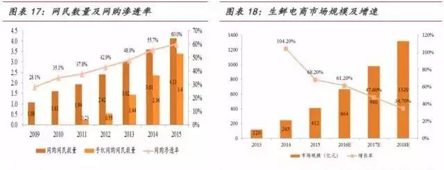 我国网购网民数量自2009年以来逐年提升,尤其手机网购用户在近五年间呈爆发式增长,网购逐渐渗透于居民生活,成为不可缺少的一部分,生鲜电商也得以较快发展。数据显示,我国网购数量持续高速增长,其中手机网购网民数增长极为显著,网购渗透率逐年攀升,成为推动电商发展的重要力量。