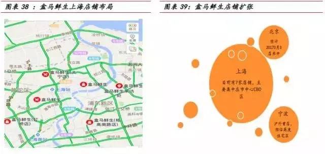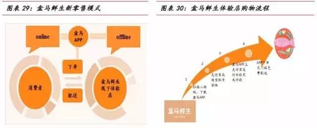 ②线下:目前盒马鲜生实体门店主要集中在上海,客户可进店购买生鲜食品或app下单享受半个小时送到家服务,不想自己做还可直接让配套的餐厅进行现场加工,离店结账时通过支付宝结账。