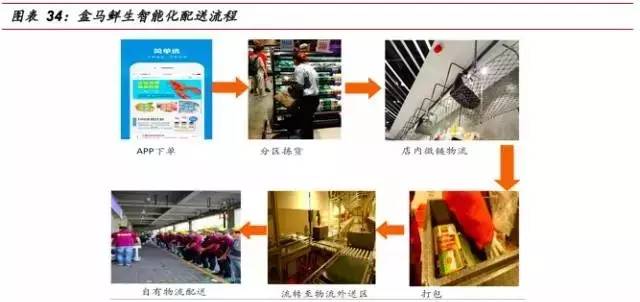 物流配送:盒马的城市配送中心,包括线下门店的冷库、常温库和加工中心等直接接单指派。配送员依靠配送app,确认取货后,被分配路径,在周围5公里内进行配送。盒马自有物流体系和扁平化散射状配送模式使其能实现“实现五公里半小时到达”的高速配送。自动化分拣大大节约了消费者在门店排队结账的时间,带来更加舒适的购物体验的同时,也提高了店铺出货的效率。高效的物流配送使得消费者能够真正享受到家模式购物的便捷,也保证了商品的新鲜,成为盒马鲜生打通线上线下的关键。