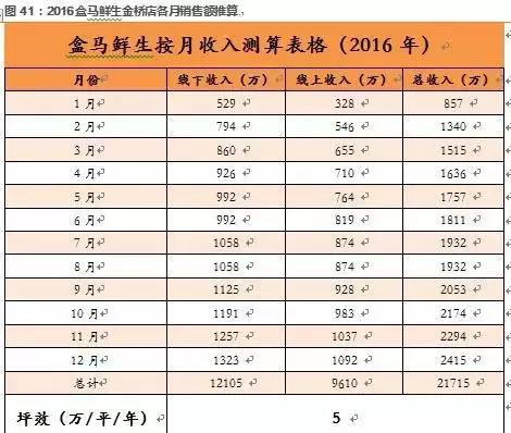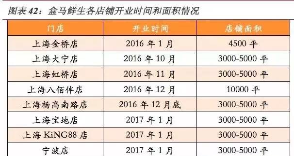 截至目前,盒马鲜生在上海已经开设金桥店、大宁店、虹桥店、八佰伴店、宝地店、杨高南路店、KiNG88店共7家线下体验店,在非一线城市宁波开设一家体验店,基于金桥店数据和相应店铺的面积和开业时间显示2016年除了金桥店外,其余店铺基本上在2016年底和2017年初开设,由于开业初期为各店培育期,其销售相对较小,因此2016年整个盒马鲜生的销售额可以基本上确定为金桥店一个门店。