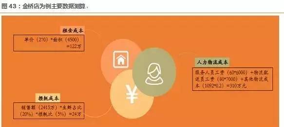 盒马金桥店地处金桥国际广场,为上海最繁华的CBD之一;盒马采取自营配送物流,并搭配数十位分拣员、导购员、促销员服务团队;生鲜行业损耗率常年维持在8%-10%之间,损耗成本一直是行业发展不可忽视的因素之一;因此,租金成本、人力物流成本、生鲜损耗成本是费用测算的主要考察对象: