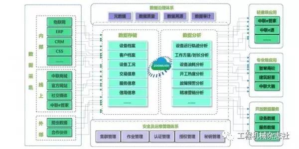 当谈及工业大数据的来源及与互联网数据的区别,周志忠博士告诉我们,对于工业企业而言,也有一部分互联网的数据,如网上商城、微信应用中采集到的用户行为相关的数据,但更多的是围绕自身产品,从研发、生产到销售、服务,这样一个完整系列产品数据,这些数据是我们非常重要、也是核心的数据来源。中联重科数据来源主要包含如下3类:物联网数据、内部核心业务系统数据、外部应用平台数据。