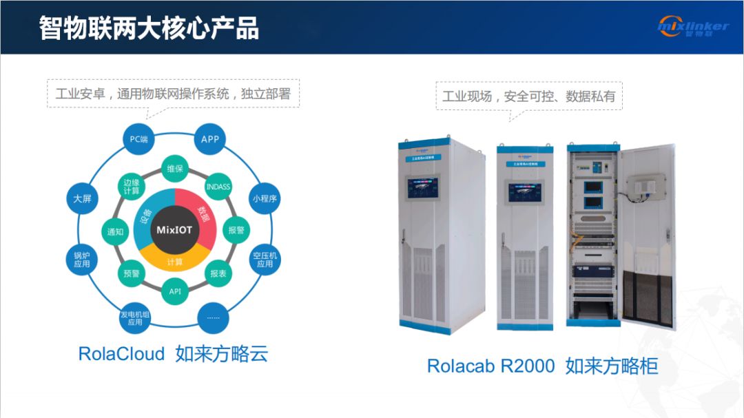 目前工业互联网外网有一些头部企业提供的很完善的云服务平台作为基础设施,发展更快,案例更多。而内网的核心是工业现场各种设备的连接,与传统互联网有较大的区别,工业现场的复杂性、设备种类的多样性、工业产品的异构性都对这种连接提出了完全不同的要求,实现难度也更大。虽然有不少从业者在内网建设上着力,但由于缺乏底层方法论和通用工具,只能实现某类设备或某个工业场景的内网实施,换一类设备或换一个场景,原来的技术经验便失去了用武之地。智物联凭借对“工业”和“物联”的深刻理解,很早就预见了工业现场的重要性,在研发路径上也选择了最艰难的通用性工业设备物联技术。2014年公司成立后,经过三年左右的摸索,终于在2017年形成了“多元异构数据映射”的底层方法论,并在这一方法论的基础上开发了智慧工业核心引擎——MixIOT,它能够为各种物联网场景和解决方案提供一致的基础底层平台,具有跨平台、跨领域、工业级、开放性、可独立部署等特点,既支持云部署,也支持工业现场部署。2018年到2019年,智物联专心打磨MixIOT,努力使之产品化,最终形成了“如来方略云(RolaCloud)”和“如来方略柜(RolaCab)”两大解决方案产品。