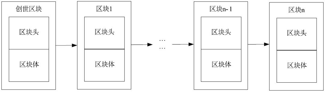 图2 基于区块链的威胁情报共享及评级方法和系统的区块结构该区块包括区块头和区块体。其中,区块头由前区块的散列值、Merkle根、随机数、时间戳构成。区块体由IP地址信息、域名信息、URL信息、安全事件信息、漏洞信息、威胁情报源可信度、威胁情报源贡献率构成。(1)前一区块的散列值,由前一个区块的所有信息加上前时间戳,通过哈希所产生的值。(2)Merkle根,由区块体中所有信息构成Merkle树,计算Merkle树根的散列值,可以将区块头和区块体绑定在一起。(3)随机数,是当前节点根据所有的公钥信息以及当前的时间戳,通过SHA256哈希算法来产生一个随机数,此随机数要求下一个区块的哈希值要以该数目为开头的一串数字。可以防止攻击者伪造区块链的区块。(4)时间戳,是发布该区块的节点在发布时打的时间标记,从1970年1月1日00:00 UTC开始,到该区块产生时间隔的秒数。(5)IP地址信息,是IP地址相关的威胁情报信息。(6)域名信息,是域名相关的威胁情报信息。(7)URL信息,是URL相关的威胁情报信息。(8)安全事件信息,是安全事件相关的威胁情报信息。(9)漏洞信息,是漏洞相关的威胁情报信息。(10)威胁情报源可信度,是威胁情报源的可信度相关信息。(11)威胁情报源贡献率,是威胁情报源的贡献率相关信息。基于区块链技术构建威胁情报信息以及威胁情报源的可信度、贡献率的区块链,其区块链的链式示意图如图3所示。该区块链由创世区块、区块1、区块2、…、区块n-1、区块n组成。
